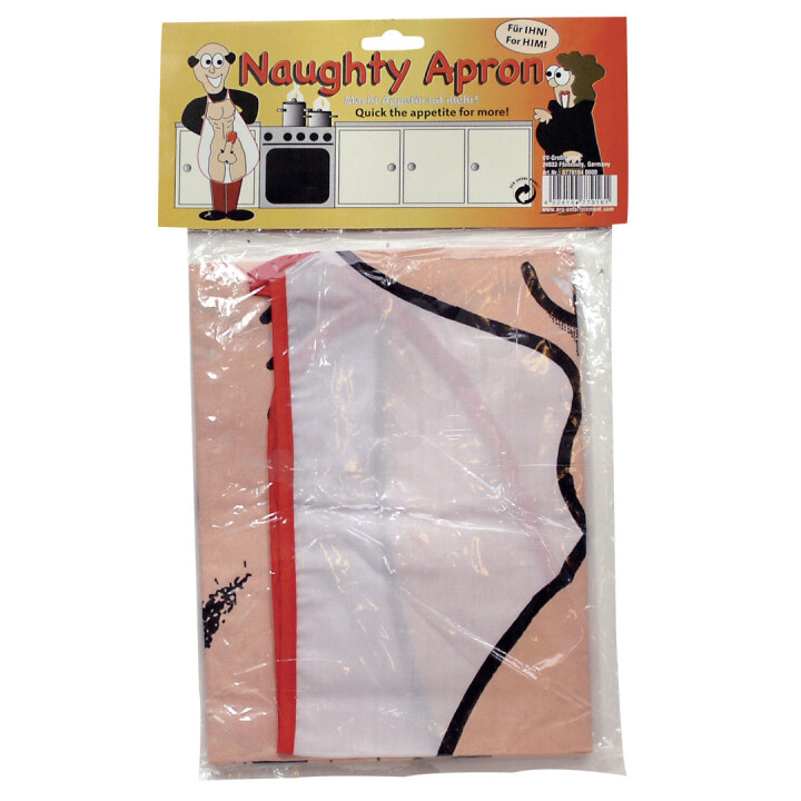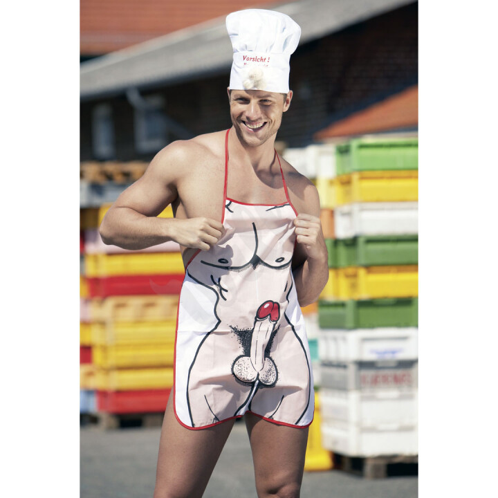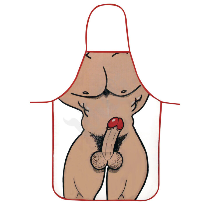 Zábavná látková zástěra na vaření s kresleným obrázkem nahého mužského těla.