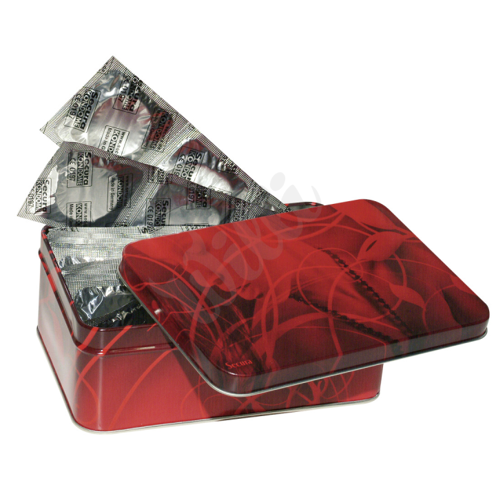 Balení 50-ti kusů kondomů v plechové krabičce.